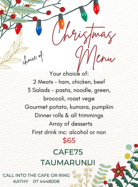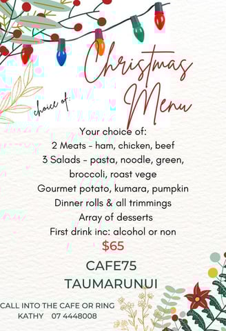 and Takeaways on Friday night. Or get a group together and join us for a Buffet Christmas meal. Phone us (07) 444 8008